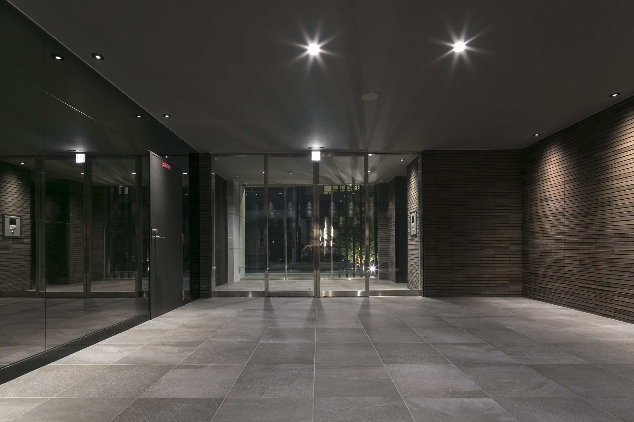 利便性に優れた場所に完成した本建物のデザインはシンメトリーを基軸にしながらも外壁の手すり壁に用いたガラス材の色調に変化をつけることで、シンプルすぎないエレベーションとし低層階の重厚感ある大判タイルとのバランスに配慮しました。